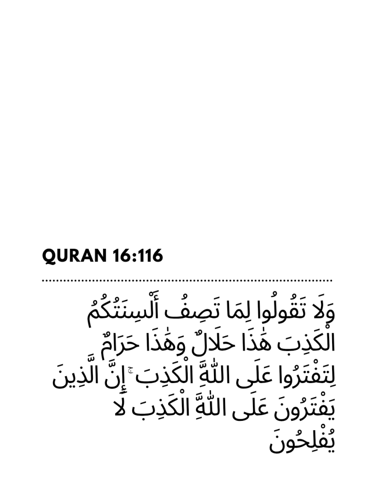 وَلَا تَقُولُوا لِمَا تَصِفُ أَلْسِنَتُكُمُ الْكَذِبَ هَٰذَا حَلَالٌ وَهَٰذَا حَرَامٌ لِتَفْتَرُوا عَلَى اللَّهِ الْكَذِبَ ۚ إِنَّ الَّذِينَ يَفْتَرُونَ عَلَى اللَّهِ الْكَذِبَ لَا يُفْلِحُونَ