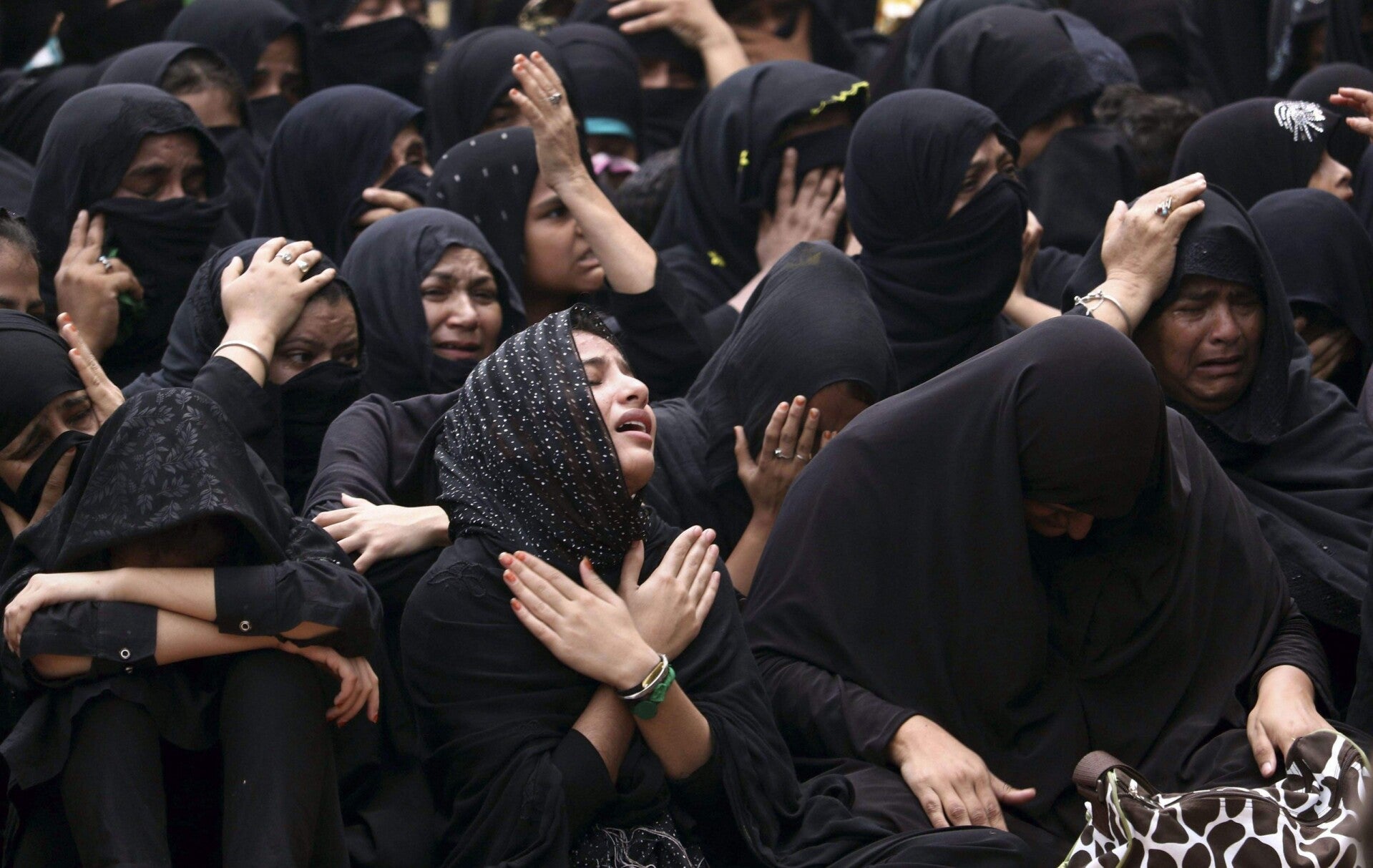 Men beat their chests in rhythm; some strike their heads with open palms until their skin reddens. The sound grows like a wave: thump after thump after thump, a storm of grief crashing in unison.